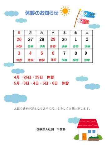 2026年 ゴールデンウィークの休診日はカレンダー通りとなります。